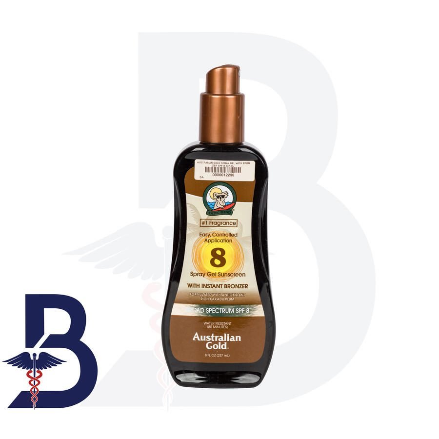 AUSTRALIAN GOLD SPRAY GEL WITH BRONZER SPF 8 237 M A broad-spectrum bronzing sunblock spray gel. Contains natural sunflower, tea tree & olive fruit oils to provide supreme hydration.